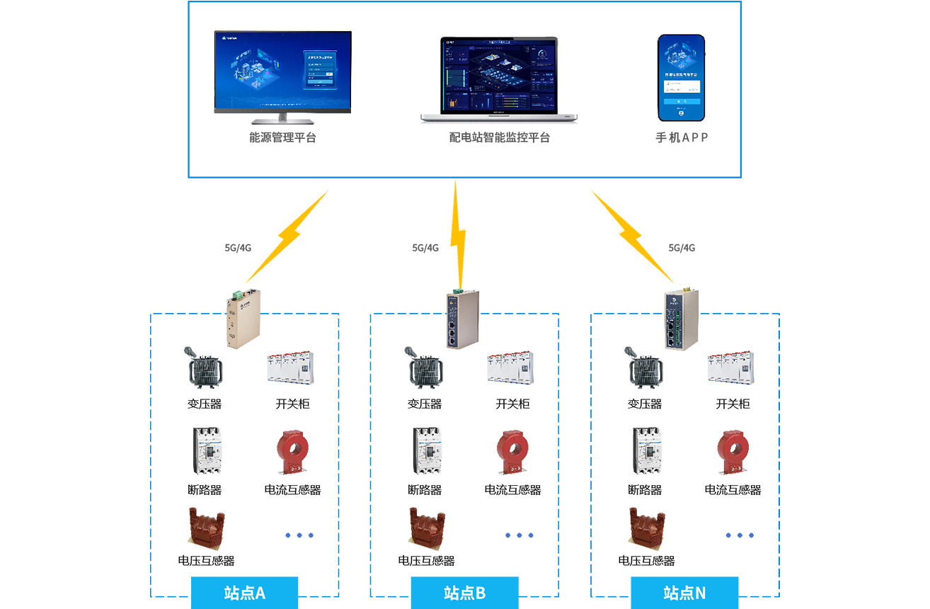 通過物通博聯的能源電力網關采集配電站的各類設備(如變壓器、開關柜、斷路器等)將采集到的配電數據(如電流、電壓、溫度、濕度等)傳輸至配電站智能監控平臺。平臺實時監測設備狀態,當出現異?;蚬收蠒r及時發出預警,并提供故障診斷和處理指導。同時具備電能質量監測功能,支持遠程運維操作和負荷優化管理。