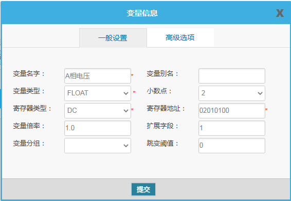 變量配置主要是定義變量名(自定義內容,不可使用中文命名)、變量別名(自定義,可使用中文名字)、寄存器類型和寄存器偏移地址(請查閱對應支持的數據標識),并定義一些數據規則(如:倍率、小數點、單位、告警)