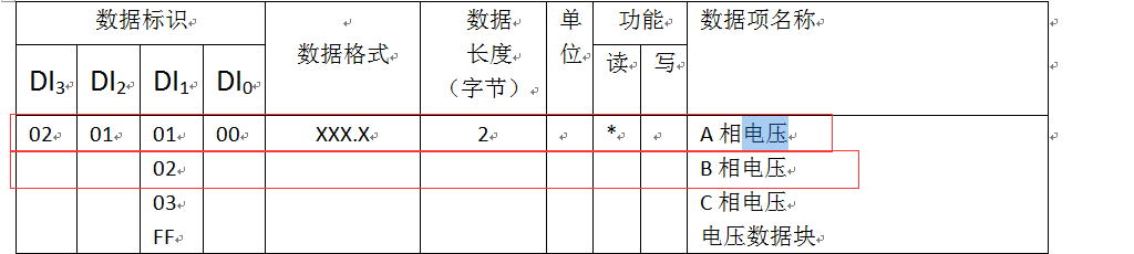 寄存器地址:查表獲取,比如DL/T645-07協議的A相電壓,查表對應的數據標識是02010100,B相電表對應02010200。