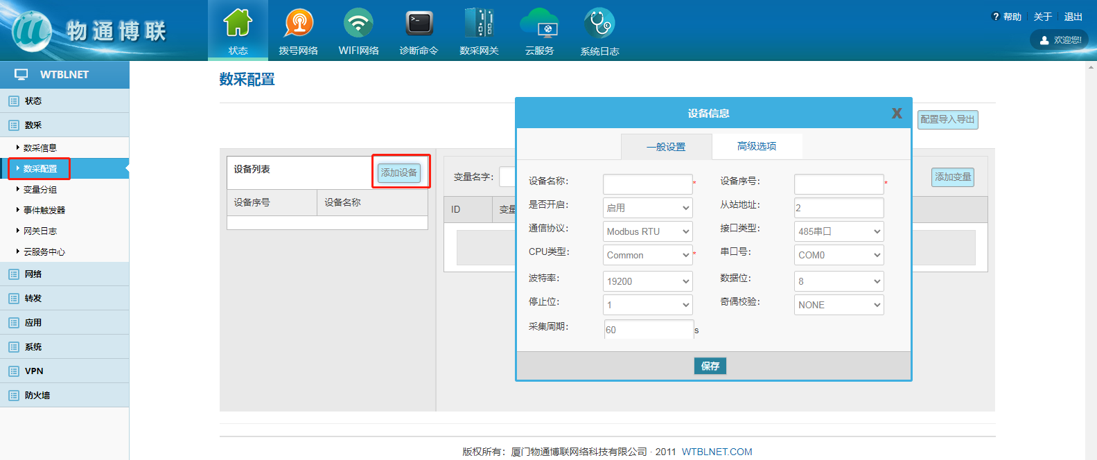 添加設備:設備名稱和設備序號可以自定義,從站地址、通訊協議和通訊參數根據設備實際參數進行配置,最后保存。