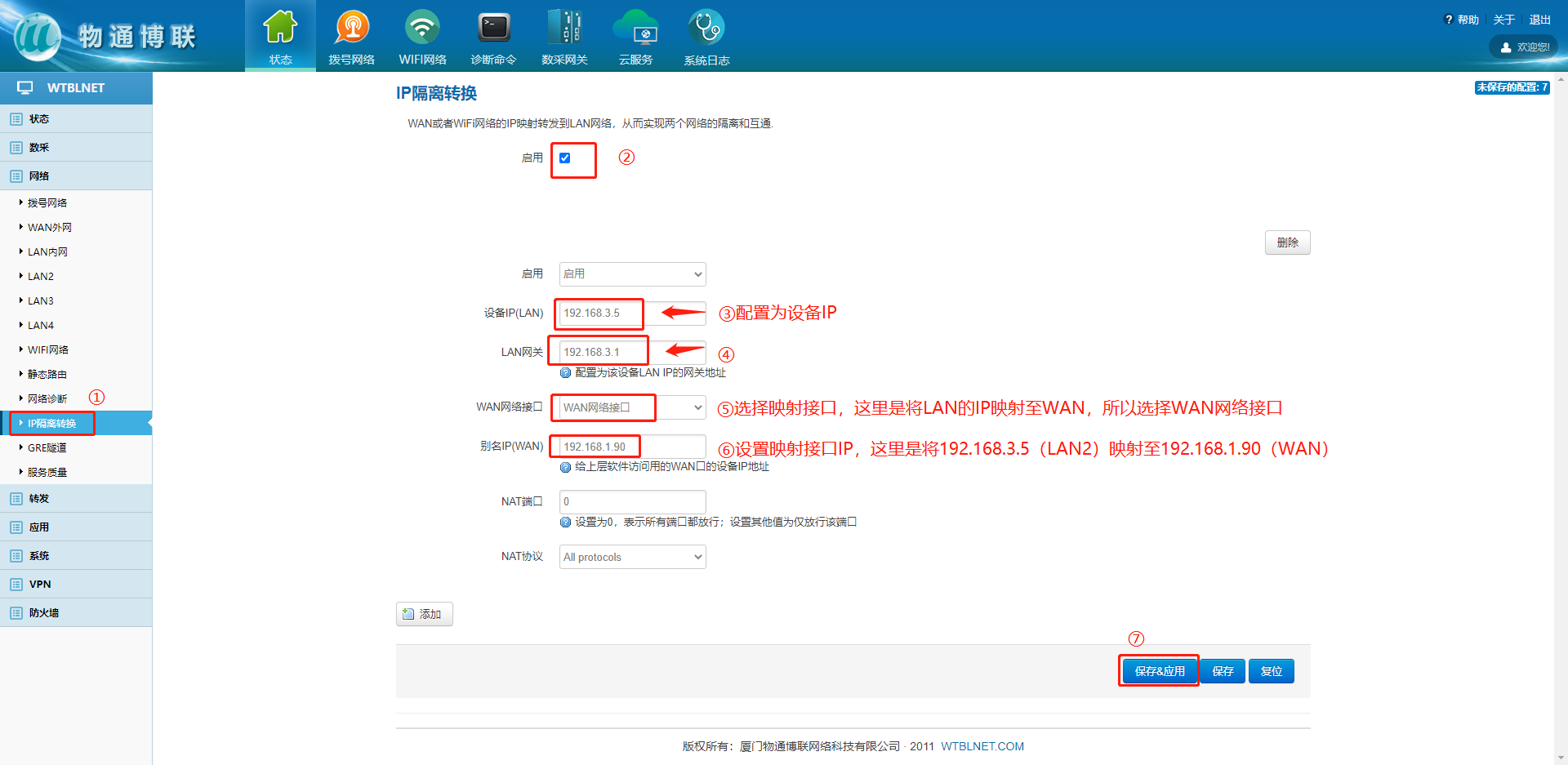 此處舉例PLC(IP:192.168.3.5)連接網關LAN口(IP:192.168.3.1),并將PLC的IP映射至網絡隔離器WAN口(IP:192.168.1.90),上位機(IP:192.168.1.8)即可通過隔離器WAN口訪問至位于隔離器LAN口的PLC。