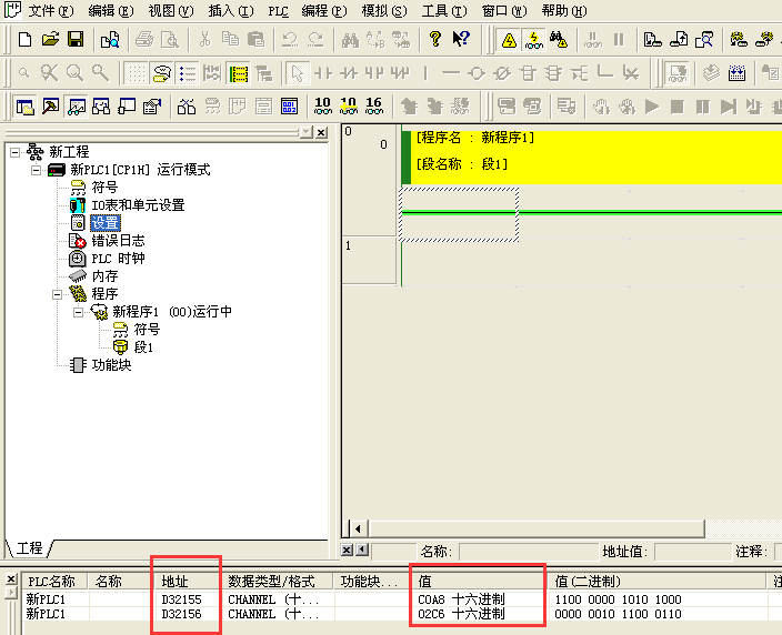 啟動CX-P,打開菜單欄中的PLC---自動在線---USB連接,連接成功后,打開菜單欄中的視圖---窗口---查看,輸入地址:D32155、D32156,將查詢得出的十六進制的值換算成十進制的值,就是CP1W-CIF41選件板的IP地址(C0A802C6=192.168.2.198)。