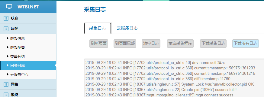 采集日志用于診斷網關采集現場設備的通信情況和報文收發情況、以及遠程配置交互等情況。