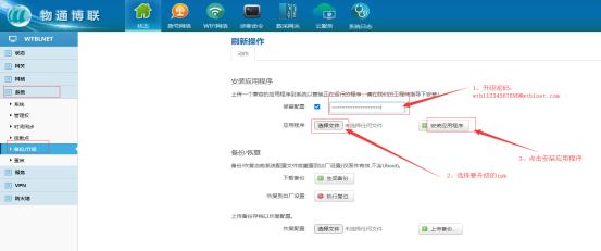 進入系統→備份升級,輸入升級密碼:wtbl1234567890@WideIOT.com ,然后選擇對應要升級的ipk,最后點擊安裝,進度條顯示100%即完成操作。
