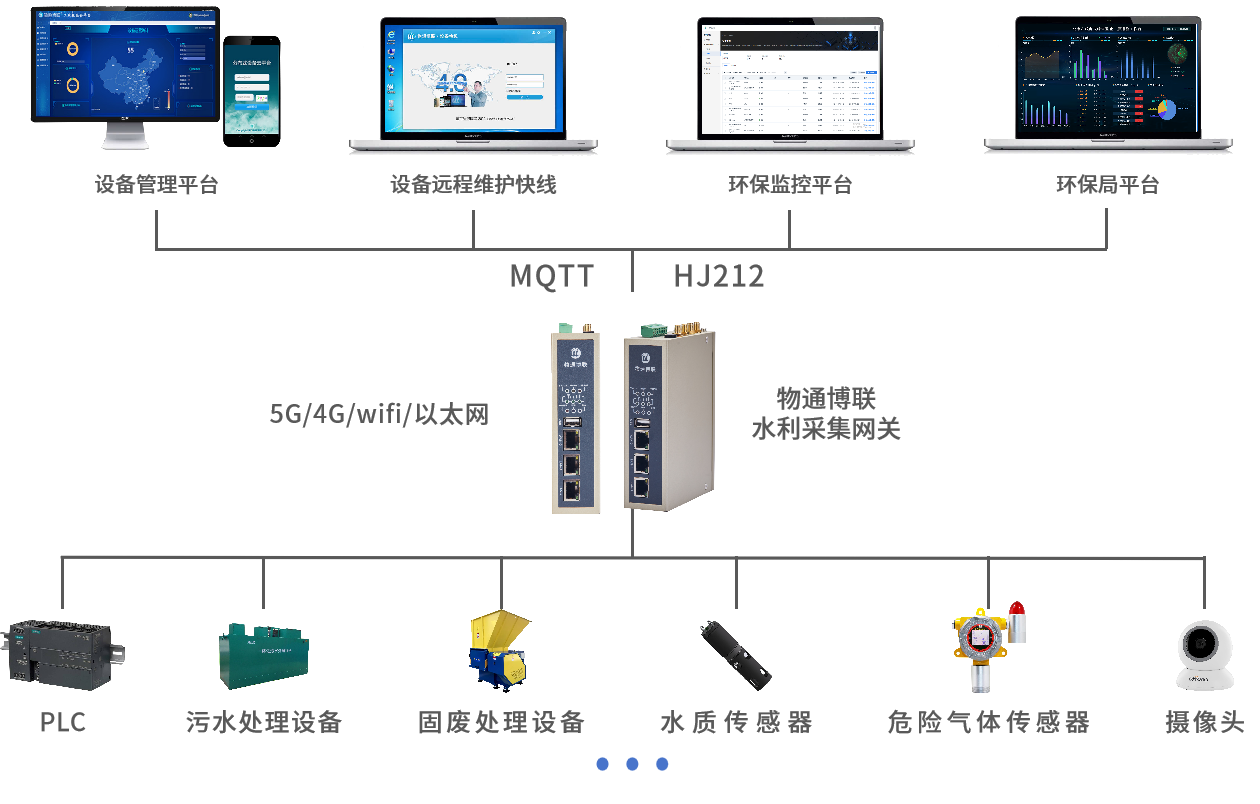 物通博聯環保采集網關可以連接各種環保設備、傳感器、儀表、IO數據和PLC,通過MQTT協議上傳到設備管理平臺和通過HJ212協議上傳到環保局監控平臺,實現設備遠程監控和數據分析,為環境監測和管理提供重要的決策支持。