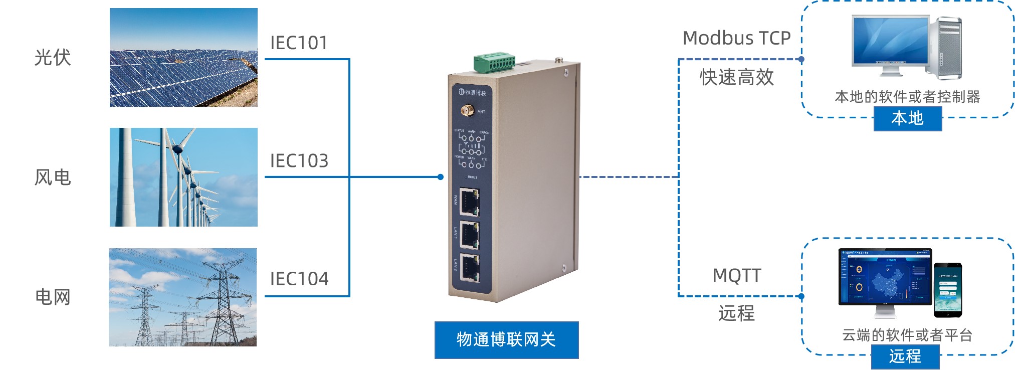 網(wǎng)關(guān)通過(guò)將電力行業(yè)常用的IEC101、103、104等協(xié)議轉(zhuǎn)換為ModbusTCP和MQTT協(xié)議,將采集的數(shù)據(jù)同時(shí)上傳到本地監(jiān)控系統(tǒng)和云平臺(tái),實(shí)現(xiàn)本地和云端同時(shí)對(duì)新能源發(fā)電站的遠(yuǎn)程監(jiān)控和控制,對(duì)數(shù)據(jù)進(jìn)行分析和可視化展示,隨時(shí)了解設(shè)備運(yùn)行狀態(tài),從而提高站內(nèi)資源利用率和生產(chǎn)力水平,保障新能源發(fā)電設(shè)施的高效穩(wěn)定運(yùn)行。