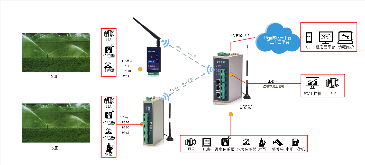物通博聯的水肥一體化方案是通過LORA數采終端WD140或WD240與農田現場的溫濕度傳感器、PLC、水肥一體機等設備連接,同時可以通過工業智能網關WG593獲取數據,并通過4G/WIFI等方式上網,MQTT方式上傳數據,將數據傳到物通博聯數據云平臺或第三方平臺,云平臺實時監控現場設備和水肥一體機的實時運行狀態,實現電腦端和手機端的遠程監控和控制,監控整個農田的運行情況,科學合理的安排灌溉施肥計劃,實現農田自動化灌溉與施肥。