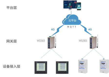 針對(duì)項(xiàng)目現(xiàn)場(chǎng)與需求,物通博聯(lián)提供一套產(chǎn)業(yè)園能耗監(jiān)測(cè)物聯(lián)網(wǎng)解決方案,通過物通博聯(lián)·工業(yè)智能網(wǎng)關(guān)WG583與電表RS485串口通信連接,采集能耗數(shù)據(jù)并通過MQTT協(xié)議Json格式傳輸?shù)皆品?wù)器中,在客戶云平臺(tái)中實(shí)現(xiàn)能耗遠(yuǎn)程監(jiān)測(cè)、自動(dòng)預(yù)警、成本核算、數(shù)據(jù)分析等功能,減輕巡檢工人的勞動(dòng)強(qiáng)度,降低人工成本,同時(shí)也能為減少能源浪費(fèi)、提高能源利用效率提供可靠數(shù)據(jù)支持。